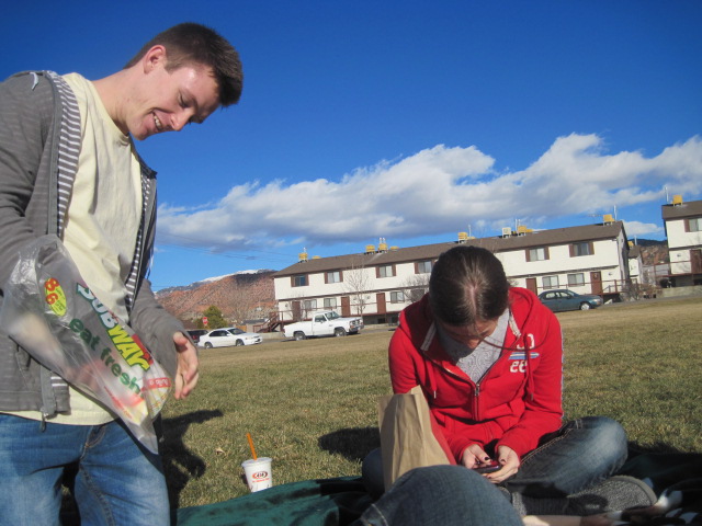 4:00 pm we had our picnic! We drove out to this field and plopped Sam's blanket Power and Strength on the grass. After about 5 minutes and eating half of our meals, we were FREEZING!! So we packed up and left. Yeah we're so tough. Don't laugh at my pictures either haha I'm not a photographer.