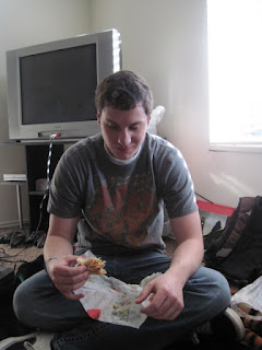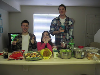 After the hamburgers were done cooking, it was time to eat and watch the game! Oh yeah I forgot to tell you that our "party" consisted of Sam, Paige, Cody and Myself. Haha we're too cool! Here's the party people with our feast of our food we prepared for just the four of us.